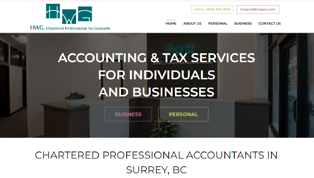 Located in Surrey (Cloverdale), British Columbia, since 1971, HWG, Chartered Professional Accountants proudly helps clients throughout the Lower Mainland and across Canada. Our team of chartered professional accountants provides helpful business and personal tax services. Our continued growth proves the success of our client relationships.